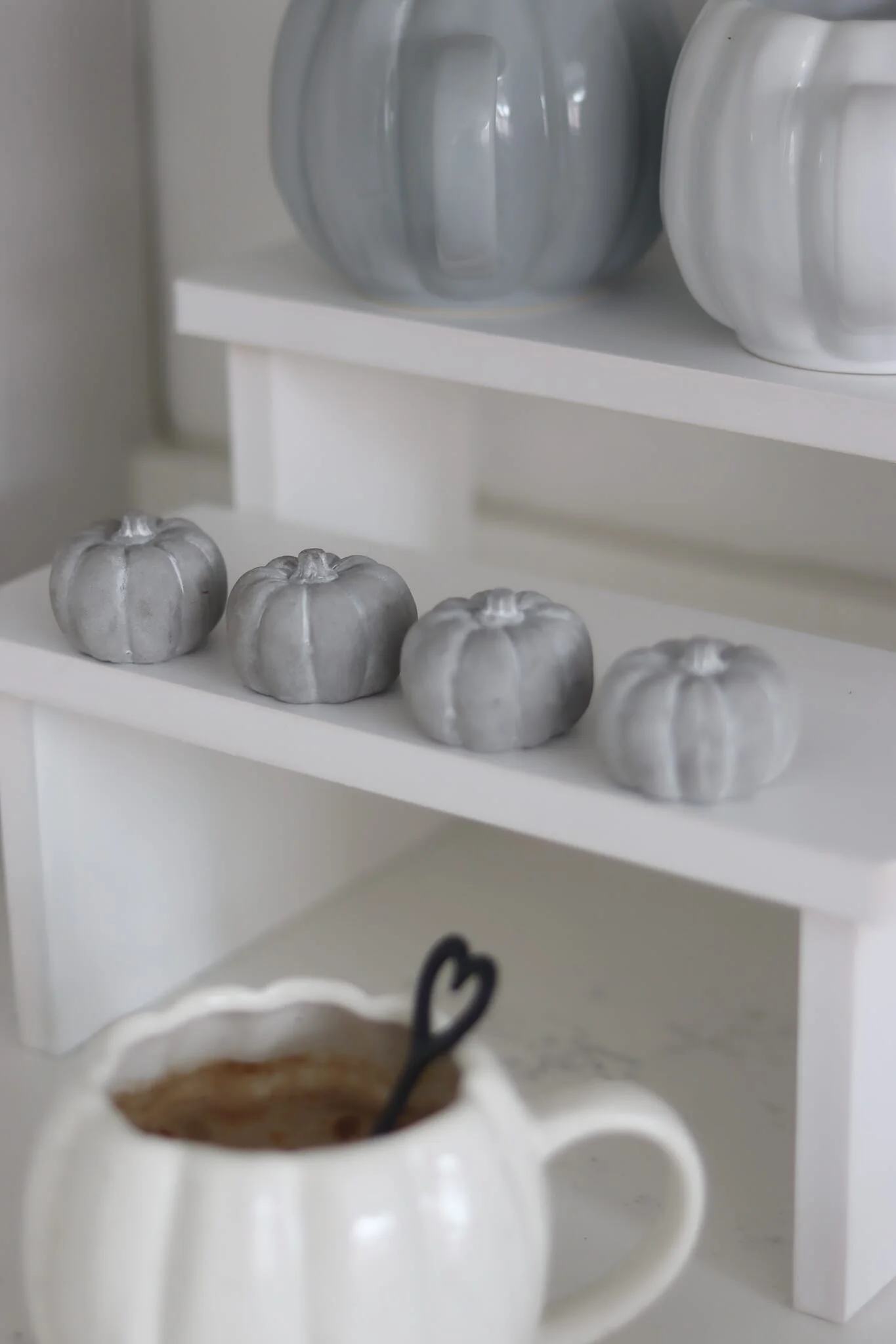 Add a cute cosy touch to your autumn decor with the Tiny Grey Resin Pumpkin 4 pc Set.