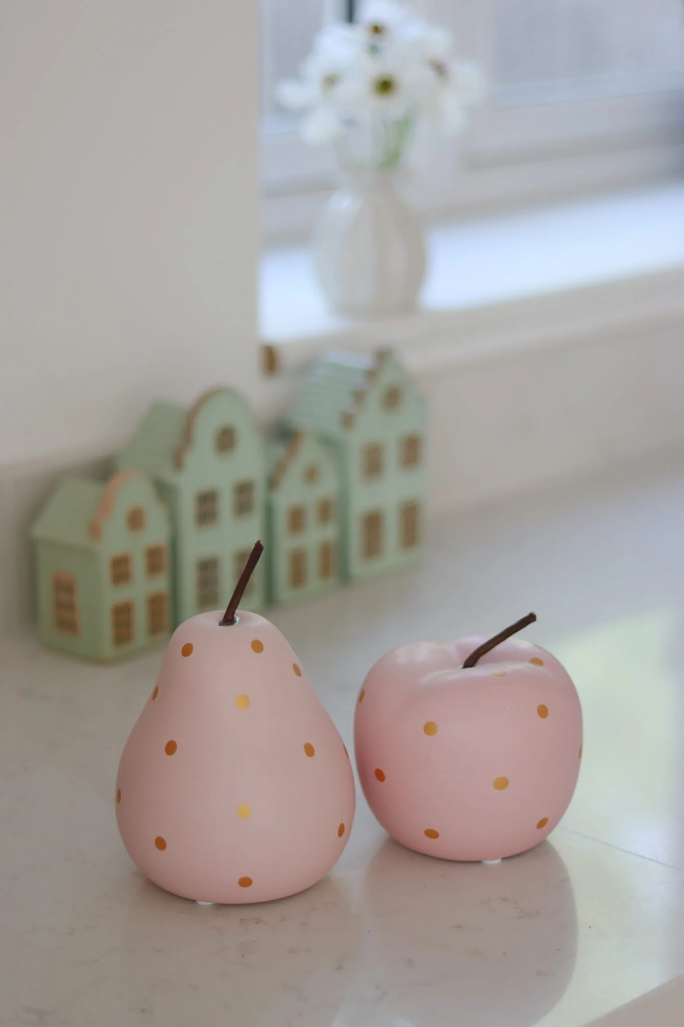 The set compromises of one Apple with Gold polka dots, and one Pear with Gold polka dots. Both feature a beautiful natural coloured stem.